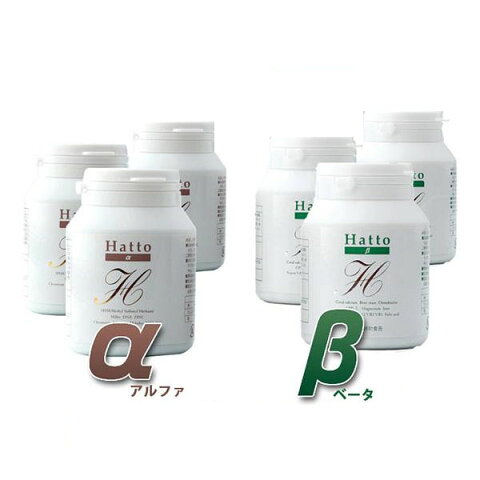 Hatto-α、Hatto-βの2種類を各3本のセットにしました!!栄養成分●Hatto-α【1日目安量8粒(2.4g)あたり】熱量:7.87kcal、たんぱく質:0.11g、脂質:0.10g、炭水化物:1.62g、ナトリウム:3.6mg、亜鉛:8mg、ビタミンC:53mg●Hatto-β【1日目安量8粒(2.4g)あたり】熱量:6.19kcal、たんぱく質:0.46g、脂質:0.07g、炭水化物:0.94g、ナトリウム:26.4mg、鉄:6.4mg、マグネシウム:26.88mg、カルシウム:216mg、ビタミンC:86.4mg、ビタミンB1:1.92mg、ビタミンB2:1.28mg、ビタミンB6:1.92mg、ビタミンB12:1.92μg、ナイアシン:14.72mg、葉酸:216μg原材料【Hatto-α】名称:メチルサルフォニルメタン加工食品メチルサルフォニルメタン、ミレットエキス末、ビール酵母(亜鉛、クロム、セレン含有)、メカブパウダー、マルトオリゴ糖、ブドウ糖果糖液糖、サケ白子抽出物、DHA含有精製魚油、砂糖、脱脂粉乳、卵白分解物、脱脂コーン胚芽、結晶セルロース、ショ糖脂肪酸エステル、ビタミンC、微粒二酸化ケイ素、カゼインナトリウム、香料、乳化剤、増粘多糖類、メタリン酸ナトリウム、酸化防止剤(茶抽出物、ビタミンE) (原材料の一部に大豆を含む)【Hatto-β】名称:サメ軟骨抽出物加工食品ビール酵母、鮫軟骨抽出物、乳たん白分解物、澱粉、サンゴカルシウム、硫酸マグネシウム、結晶セルロース、ビタミンC、ショ糖脂肪酸エステル、クエン酸第一鉄、ナトリウム、ナイアシン、ビタミンB6、ビタミンB1、ビタミンB2、葉酸、ビタミンB12アレルギー表示(原材料の一部に以下を含んでいます)卵乳小麦そば落花生えびかに●● fk094igrjs
